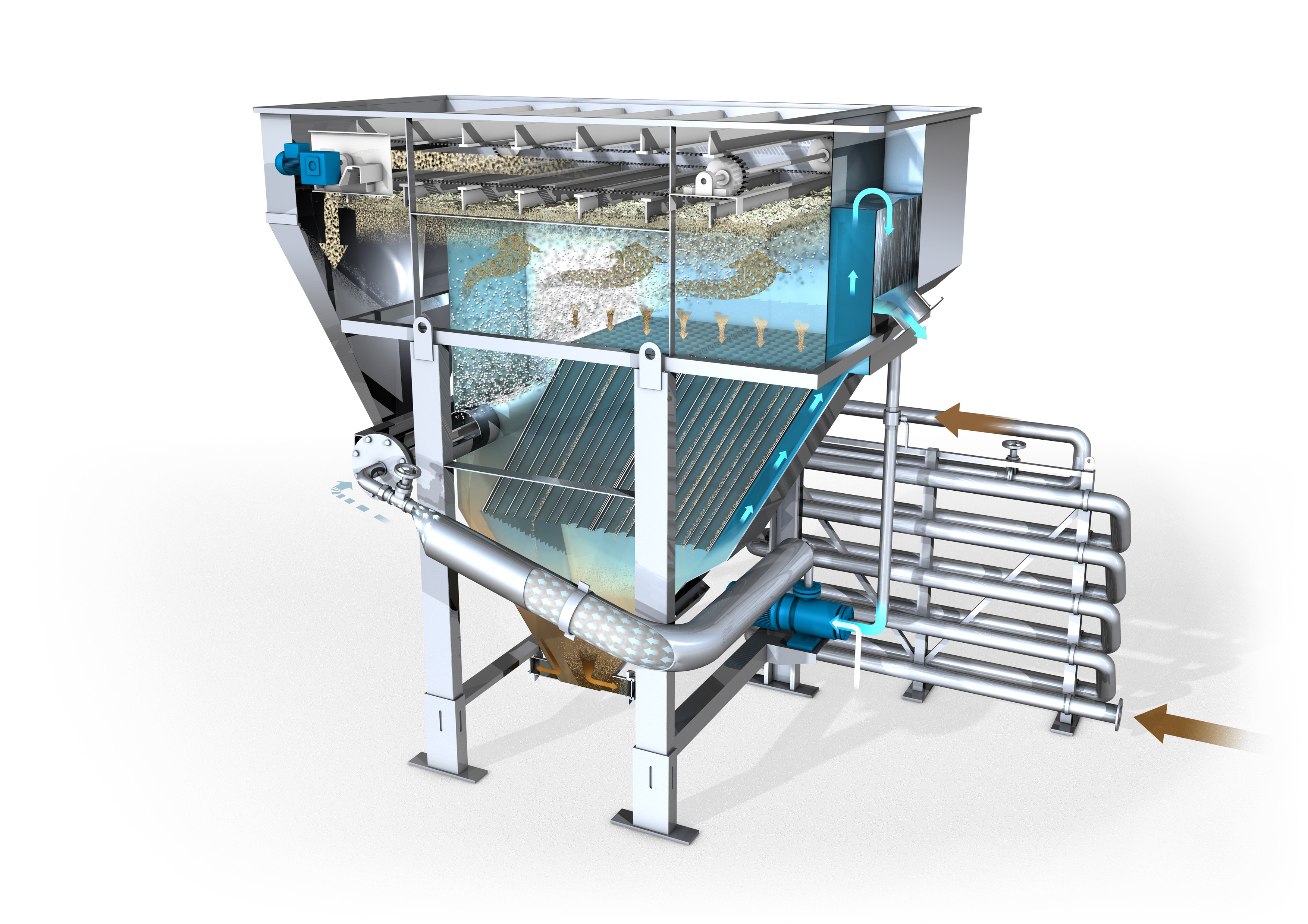 HUBER flotasjonsanlegg gir en merkbart forbedret flotasjonsprosess. Det har en spesiell innløpsstruktur som sikrer optimal kontroll over gjennomstrømningen i flotasjonstanken.